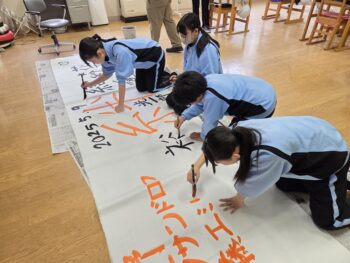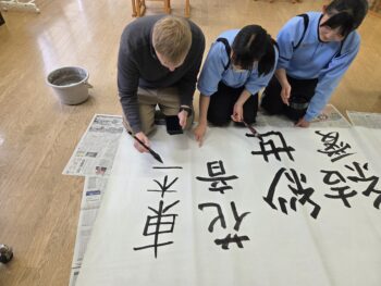 続けてオーストラリアの学校で披露する「習字パフォーマンス」の練習も行いました。ノリノリの音楽に合わせて、まずは真ん中に「絆」と書き、続けて周りに自分の名前やマークを書いていきます。(何故か教員の名前はカタカナになっていました。)完成した作品をみなさんに披露してパフォーマンス終了。その後オーストラリアの学生にも習字の体験をしていただく予定です。