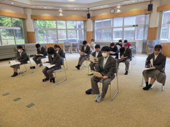 来週木曜日から1泊2日の校外学習に出かける1,2年生。9日(金)には説明会がありました。スローガンは「Let’s enjoy Yamanashi.」。「学ぶだけでなく、楽しむことも大切」という考えから、このスローガンになったそうです。1日目は10:30に甲府駅到着後、グループごとに「自主見学」。17:00に石和温泉駅に集合します。各グループでテーマを決め、行き先も交通機関も自分たちで計画します。6時間半にも及ぶ「自主見学」を計画・実行することは、きっと彼らにとっていい経験になることでしょう。2日目は富士五湖方面に場所を変え、フィールドセンターで体験活動やカレーづくりを行います。みんなで協力できるといいですね。