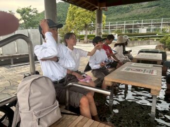 宿の温泉の前に駅前の足湯で疲れを癒しました😁