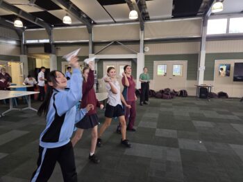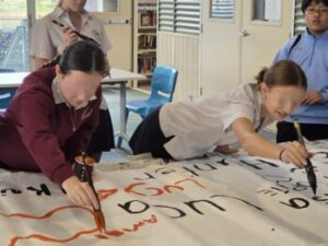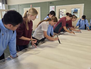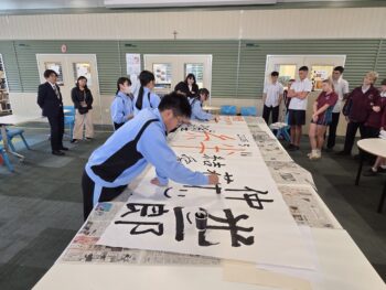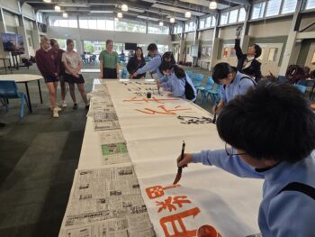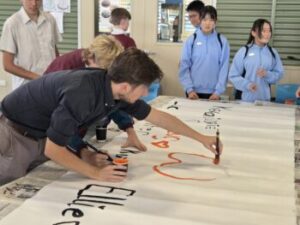 続いてホールに出て習字パフォーマンス。音楽をかけながら大きな紙にみんなで名前や言葉を書きました。現地生徒は習字をやったことがないせいかみんな興味津々でした。