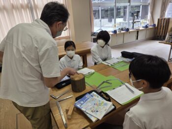 今日は22日(木)1年生の技術科の様子をお伝えします。1年生の技術科では木材を使って椅子を作るそうです。「この丸太の状態から角材を切り出しているんだよ」