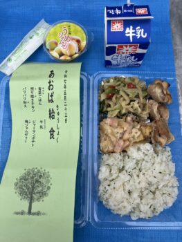 23日(金)には小中合同で給食を食べる「あおば給食」が行われました。小学生21人と中学生15人、さらに小中学校の先生たちも一緒にお弁当給食を食べます。献立は「青菜ごはん」「牛乳」「照り焼きチキン」「ジャーマンポテト」「パリパリ和え」「梅ジャムゼリー」。