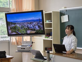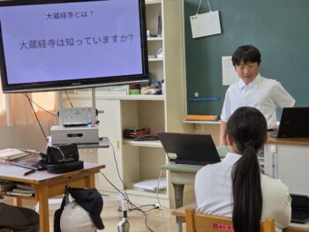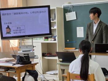 さて、今日は2年生で行われた国語の授業の紹介します。学習内容は「魅力的な提案をしよう」。本時の目標は「聞き手を意識して、資料を示しながら『校外学習で行ったところ』について、プレゼンテーションをする」というもの。今回は「校外学習で行ったところ」ということで、「武田神社」「大蔵経寺」「酒折宮」「甲府城」「ジュエリーミュージアム」「酒折ワイナリー」が選ばれていました。それぞれの場所について、「見やすく」「分かりやすく」「伝えたいことが明確」を意識しながら資料をつくり、みんなの前でプレゼンをします。プレゼンの際には「声の大きさ」「抑揚」「姿勢」「目線」等を意識することを確認していました。クイズで聞き手に問いかけたり、写真をうまく使ったり、「私のイチオシ」を紹介したり、最後に「ぜひ行ってみてください」と呼びかけたり…みんなが魅力を感じるような工夫がたくさん見られました。