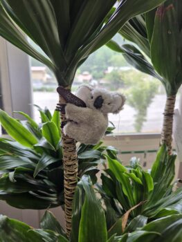 校長室の観葉植物にお土産のコアラがしがみついています♪かわいいです♪