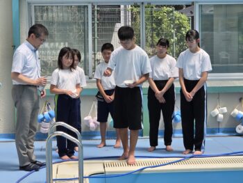 20日(金)にプール開きがありました。「プール開き」とは、今年一年間安全に水泳活動が行えるように祈願する儀式です。プール開きには小菅小中の校長と体育主任、児童会&生徒会執行部が参加しました。最初に私から「水泳学習」について大事なことを話してから、プールを酒・米・塩で清め、「安全に入れますように」と祈願しました。