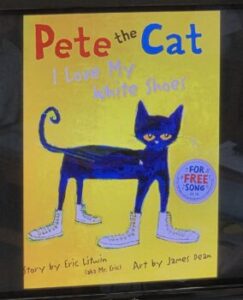 さて今日は3校時の2年生英語の様子をお伝えします。「明日に期末テストを控えた子どもたちを少しリラックスさせてあげよう」ということで、何やら楽しいことをするということを耳にしたので、様子を見に行きました。まずはALTから「これはただの遊びのように見えるかもしれませんが、これまで身につけてきた英語のスキルを実践的に活用する活動です」とのメッセージ(^_^)使うテキストは「Pete the Cat」(小学校の図書館に「ねこのピート」シリーズはありませんでしたか?)今回はその「I love My white Shoes(大好きな白いくつ)」