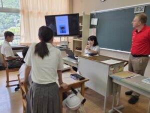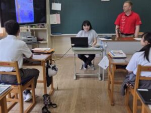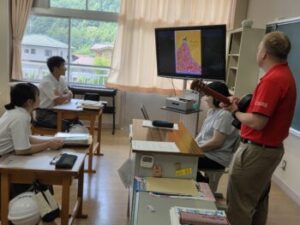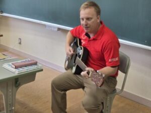 生徒が一人一文を順々に声に出して読みながら物語が進みます。そしてお決まりの場面でALTがギターを片手に歌い始めます♪「“I love My white Shoes. I love My white Shoes.”」