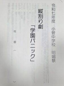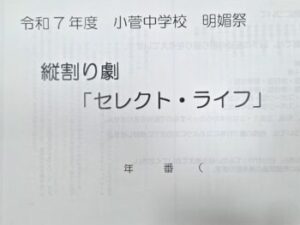 明媚祭の内容は「全校作品」「劇」「合唱」といったものです。昨年度の「全校作品」は段ボールと発泡スチロールを使用したボードを作成したそうです。今年度はどんな作品となるのか今から楽しみです♪今は、作品の原案を募集しています。デザインの原案、作品の形態、デザインに込めた思い…みんなの気持ちが一つになるような全校作品ができるといいですね。「劇」は1~3年生が2つのたてわりチームに分かれて取り組みます。3年生を中心に台本を選び、先日読み合わせをしました。明日はそれぞれ配役の希望を取るとのこと。ちょっとドキドキしますね。ちなみに今回選ばれた台本は「学園パニック」と「セレクトライフ」です。(私自身は中学生の頃に劇をやった記憶がありません…小学生の頃の学芸会では謎のアラビア人役で「ノーノーウソナイ。ダガコレホンモノ」という一言だけのセリフだったという苦い記憶があります(^_^;))今の中学生がどんな劇を作り上げるのかとても楽しみです。