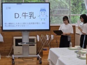 正解は「D.牛乳」(軽い運動をした後に牛乳を飲むと血液量が増え、体の熱を出しやすくなります。)