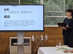 正解は「A.気温30℃ 湿度85%」(熱中症は気温だけでなく湿度にも注意が必要。高湿度の環境では汗が蒸発しにくいため、体温が下がりにくくなる。扇風機やうちわで風を送るなどの工夫が必要。)