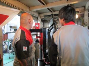 「こすげ自動車」。この日はフロントタイヤを洗ったりグリスを塗り直したりしたようです。写真を見ると、もう“新入社員”ですね(^^)本人の感想には「礼儀はやっていれば自然とできるようになるけど、技術面は今のうちから勉強しておかないとできない。」とありました。いいじゃないですか!14歳から経験を積めば、それはそれは貴重な戦力となりますね!がんばれ(^^)/