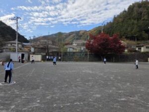 11日(火)のソフトボール。いよいよ試合形式で行われました。試合と言っても人数が足りないため、キャッチャーは相手チームから。外野も二人。今日はスリーアウト交代ではなくチームの打者が一巡したらその回の攻撃は終了。三振はあるけどファーボールはなし。秋空の下、元気いっぱい楽しそうでした(^^)