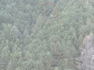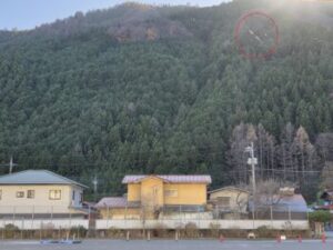 先日も見かけたのですが、晴れて風が強めの日に校舎から山の方を見ると何やらキラキラ光る糸状のものがたくさん流されていきます。(写真の赤円。ちょっと分かりにくくてすみませんm(_ _)m)