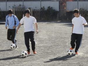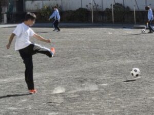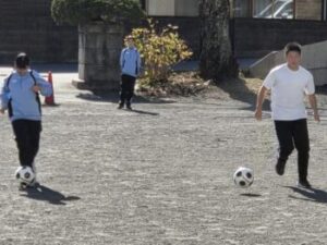 「目指すはペアをあまり動かさないこと!」「来たボールはしっかり止めよう!」ペアを次々に交代しながら、キックの練習にみっちり取り組んでいました。目指せJリーガー!