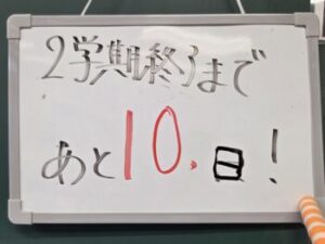 12月も2週目に入りました。本当にあっという間に時間が過ぎていきます。3年生の教室に行くと黒板に「2学期終了まであと10日!」の文字が…。「授業日数としてはあと残り11日のはず?」と思ったら、「もう明日用に数字を変えていた」とのこと(^^;)なるほど納得です。