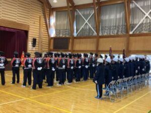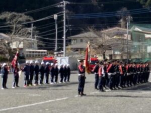 1月11日(日)には小菅村の出初め式が行われました。 中学生も少年消防隊として12名が参加しました。今年からは屋内で行われる式典と屋外で行われる操法と二部形式で開催されました。式典はとても厳粛な雰囲気の中で行われました。
