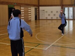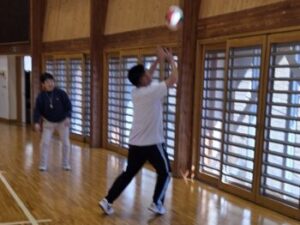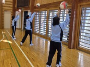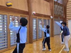 16日(金)はバレーボールの様子をお伝えします。3学期の体育はバレーボール。今日はオーバーハンドの練習に取り組んでいました。壁パス。まずは返ってきたボールをキャッチする練習を繰り返します。「(髪の毛の)生え際でとらえる」「膝を曲げてとらえて、伸ばしながらパス」といったポイントを聞きながら練習します。写真を見て分かるとおり、体育館の壁は全面ガラスのため、しっかり高く上げなければなりません!