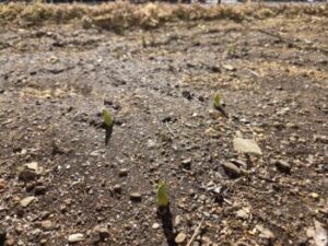 「チューリップの芽が出てる!」との報告あり。見に行ってみるとチューリップの芽がいくつも顔を出していました(^o^)これからもうしばらく寒い季節が続きますが、4月に新入生を迎える頃にはきれいなチューリップが咲き誇っているはずです♪みなさんお楽しみに~(^^)/