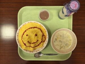 本日の給食は「バレンタインデー給食」。献立は「お絵かきオムライス」「牛乳」「クラムチャウダー」「チョコバナナプリン」。給食メモに「ケチャップで好きな文字や絵をかいて楽しんで食べましょう」とあったので、Myキャラクターをかいてみました。しかし…校長は検食のためこれを誰に見せることもできず…一人でおとなしく食べました(^^;)今日もごちそうさまでした!