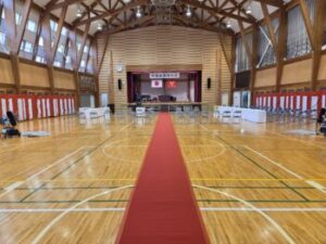 今日は1,2校時に1,2年生が卒業式の会場準備をしてくれました。真っ直ぐに敷かれた赤絨毯。きれいに並べられた座席。会場を彩る花。そして「卒業証書授与式」の看板。何だか一気に卒業式の雰囲気になってきました。