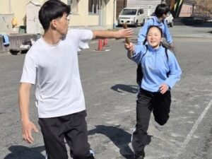 綱引きの後にしばし休憩。その後リレー。2年生の先生たちも加わりリレー勝負。一人一周(120m)。本番前には念入りにストレッチをする生徒の姿もありました。いざスタートすると…先生たちへの忖度はまるでなし。「おぉ~速い!」「後ろから来てるよ!」まさにガチンコ対決です(^o^)走り終えた後にはみんなバタンキューといった感じでした(^^;)「この後は鬼ごっこだよ!」なんて声もありましたが、さすがに「無理~」とのことでした(^^;)