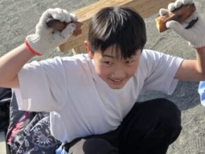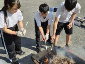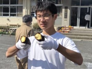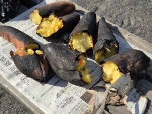 リレーの後にはお待ちかねの焼き芋タイム♪アルミホイルをはがして、いざ割ってみると…見事な焼き芋になっていました(^^)みんなお芋を手に満面の笑みです(^o^)風に乗っていい香りが漂ってきます♪「うまい!」「甘い!」「周りがサクサクしてる!」みんないい顔をしていましたね(^^)