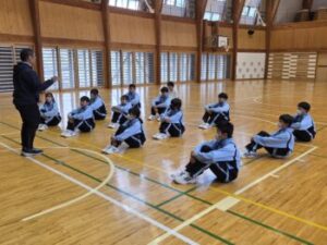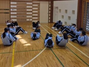 14日(火)には今年度初めての全校体育が行われました。最初に先生から今年の体育の大まかな進め方について説明がありました。「着替えを終えたら、体育館の場合は5周、グラウンドの場合は3周ランニング。続いて準備体操をしてから「サーキットトレーニング」。サーキットは「腕立て」→「腹筋」→「背筋」→「バービージャンプ」。年間通して帯状にこのトレーニングを行うことで体力アップを目指すとのことです。(話を聞いているだけでもなかなかハードそうで…みんなの顔もやや引きつっていたように見えました(^^;))