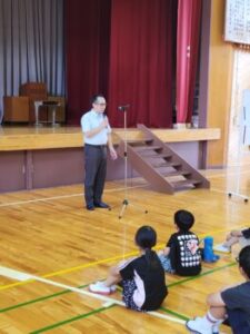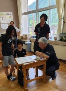 村長さんが,「どれどれ,お!5年になると字がうまいねえ」と褒めてくれました。子ども達によく寄り添ってくれます。村関係の皆さんは,小菅シャツとも言えるおそろいのシャツを着て来てくださったのも驚きでした。