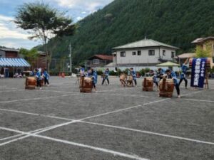 いよいよ大菩薩御光太鼓です。今年一発目の披露です。小菅の山々に太鼓の音が響き渡りました。青い法被を着て,見事な演奏をしました。