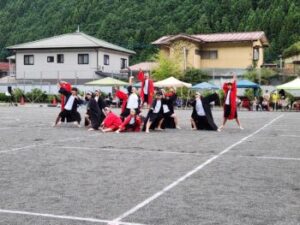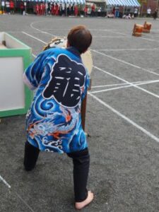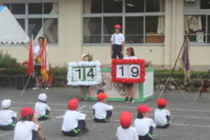 新調された玉入れのカゴで玉入れがはじまりました。小菅の玉入れは変わっています。 一回戦は普通ですが,二回戦は後ろ向きで投げます。なかなか入りません。三回戦は,赤白のカゴをくっつけて置きます。これにより,相手の方へ入れてしまう確率が高まります。入ると相手の取り分になってしまうというルールです。非常に白熱した戦いでした。一・二回戦は同数。そして三回戦は,赤21・白20という超超接戦で赤が勝利しました。この粘り勝ちが,本日の赤の強さの要因だったかもしれません。
