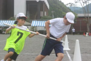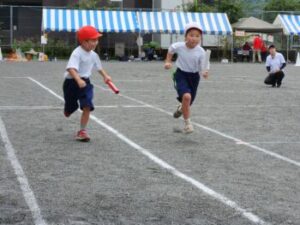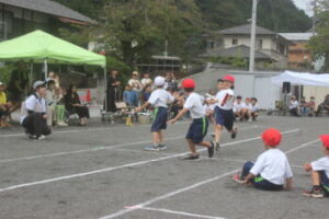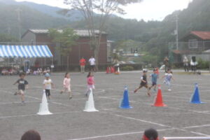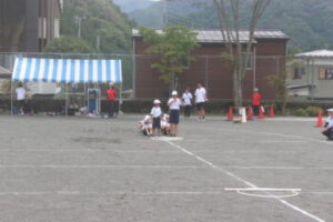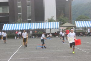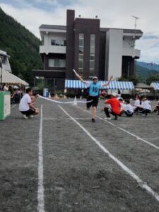 いよいよ最終種目,小中合同リレーです。7歳から15歳までのバトンリレー。小菅の子の成長を感じられる成長リレーとでも言えるでしょうか。学年が上がるにつれて見応えがありますね。中学生はトラックが小さくて走りづらいでしょうが,転ばずに爆走しました。
