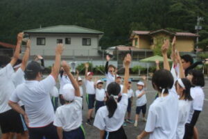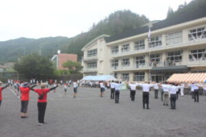 ラジオ体操です。体操の隊形に開け!元気よく広がったと思いきや,来賓の皆さんも総出でテントから出てきて一緒に体操をしました。一度NHKの巡回ラジオ体操にもお見せしたいくらいです。