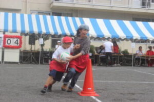 小菅は競走競技も毎年同じなので覚えやすいです。デカパン!ゴーゴーは,保護者の方もお手の物です。デカパンが脱げかけても走り続けます。