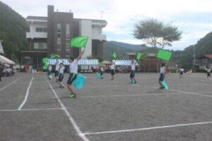 すげのこダンシングです。フラッグを振り,風を切る音が心地よかったですね。「笑顔で踊ろう」をモットーに低学年はかわいらしく,高学年はきびきびとダンシングをしました。