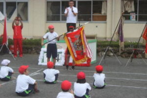前年度優勝の白組から,優勝旗が返還されました。赤組は,虎視眈々と狙っています。