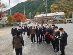 12日(水)には,日川高校の一年生27人が学校訪問で来校しました。27人の大きいお兄さん・お姉さんに皆びっくりです。今回の目的は『職場体験』だそうです。このクラスは,地域おこしに力を入れている自治体に興味をもっているとのことで,小菅村と小菅小学校の見学に来たそうです。