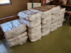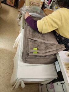 すごい量ですね。これらは本社工場から送られてきたタオルの生地ですが,これらの縁を縫いタオルに仕上げたり,エプロンや赤ちゃんようのまいかけのようなものを作ったりと,幅広く製品を作っています。