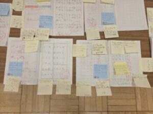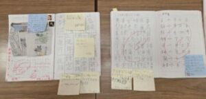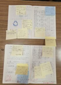 コメントが書かれたたくさんの付箋が貼られています。コメントをもらうとうれしいですよね。励みになります。私も提出してあったノート全てに付箋を貼りました。アドバイスを書いた子もいます。