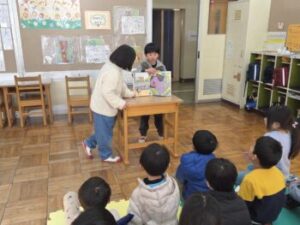 まずは,読み聞かせをしていました。2年生の二人が読みきかせてくれました。いつもは聞く方ですが,今日は立場が逆転です。ちょっと誇らしげ?かな。新入生もしっかりと聞いてくれました。この後は体育館でいくつもの遊びをしたそうです。
