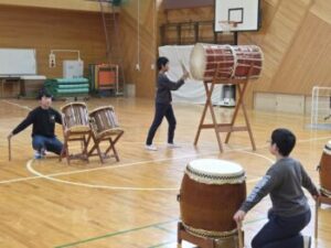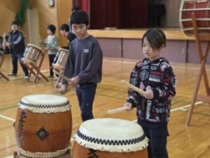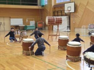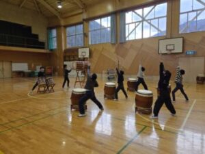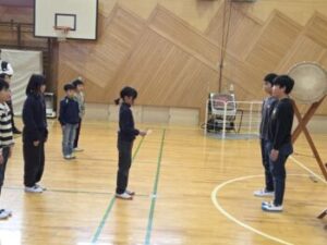 1月28日に大菩薩御光太鼓の3年生への引き継ぎと6年生の引退式が行われました。前半は3年生のデビュー練習です。早くやりたい❗という憧れがあるようです。