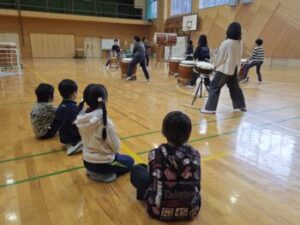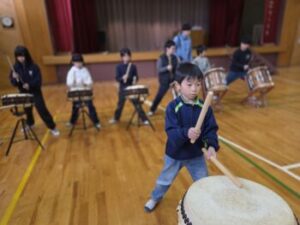 2人の6年生で引っ張ってきました。リーダーから下級生へのお礼と太鼓を頑張ってきた思いを述べました。40年続く太鼓を引き継いでいってほしいと。そして最後に6年生を交えたお別れ演奏が始まりました