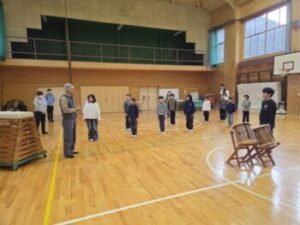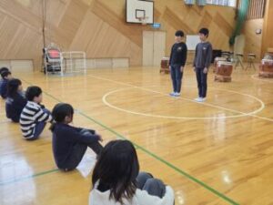 2人の6年生と4,5年生が向き合った隊形で行いました。なんでも6年生2人の顔が見られるようにしたためとか?粋な計らいです。