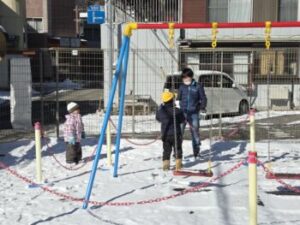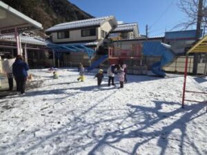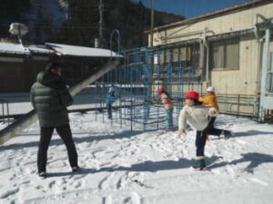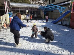 園庭の雪は30分くらいでなくなりましたね。私は保育所でも園児の皆さんから雪攻撃を受けました。雪は子どもたちを楽しませてくれる不思議な力をもっています。雪とたわむれる,そういう元気な子どもであってほしいです。