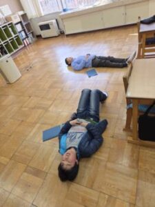6年生です。昼寝ではありません。卒業式の歌の練習中です。というか,腹式呼吸の練習をしていました。腹式呼吸は案外難しいです。歌声は,お腹から声を出す!ことが求められます。2人だけの卒様式ソング,どんな感じになるのでしょうか?頑張って!