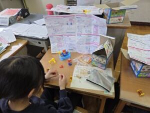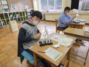 また6年生です。卒業制作で,将来の夢(なりたい職業)の人物像を軽量紙粘土で製作していました。建造業とパティシエだそうです。両方とも8頭身はあるだろうすらっとした像でした。ちょっとかっこよすぎです。もうちょっとずんぐりむっくりだぞ。