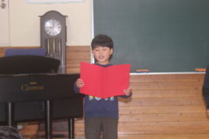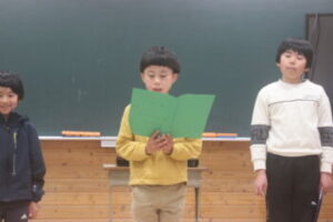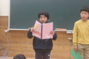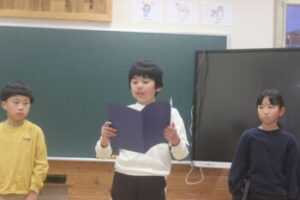 続いて学年代表から,1年間の振り返りと次学年へ向けての抱負が語られました。一年生がここまできちんとできるようになったことに驚きと感動を覚えると共に,他の学年児童の話も,うなずく内容ばかりでした。4月からが楽しみです。