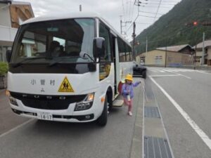 「おはようございます!」夏時刻になり,バスに乗ってくる一年生は一人ですが,元気に降りてきました。バスの乗り降りにもだいぶ慣れてきましたね。