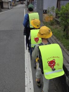 ある登校班の様子です。班長さんの後ろをカルガモのようにきちんとついて歩いています。狭い路肩なので一列は必須です。