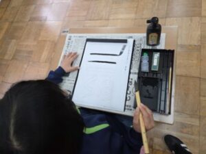 3年生は,書写のデビュー日でした。5年生の先生が3年生の書写を教えます。今日は筆の持ち方や姿勢を習い,真っ直ぐな線やひねった線を書く練習をしました。
