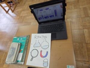 そうです。理科です。始まったばかりですので,お手製の理科ファイルの表紙を作成していました。理科に関係する道具を表紙に描きました。なかなかいいですね。
